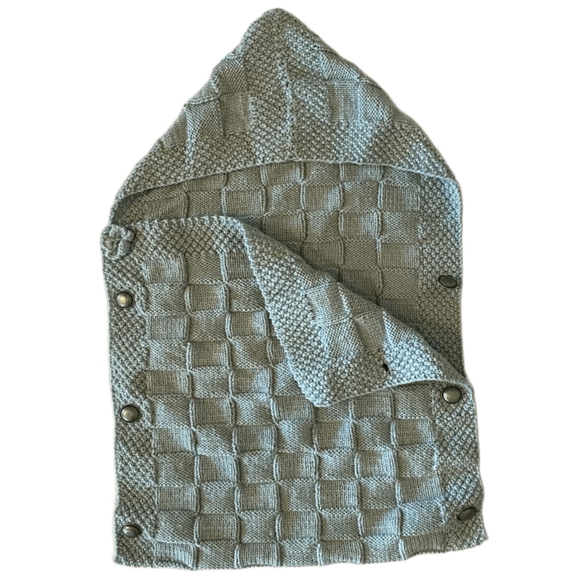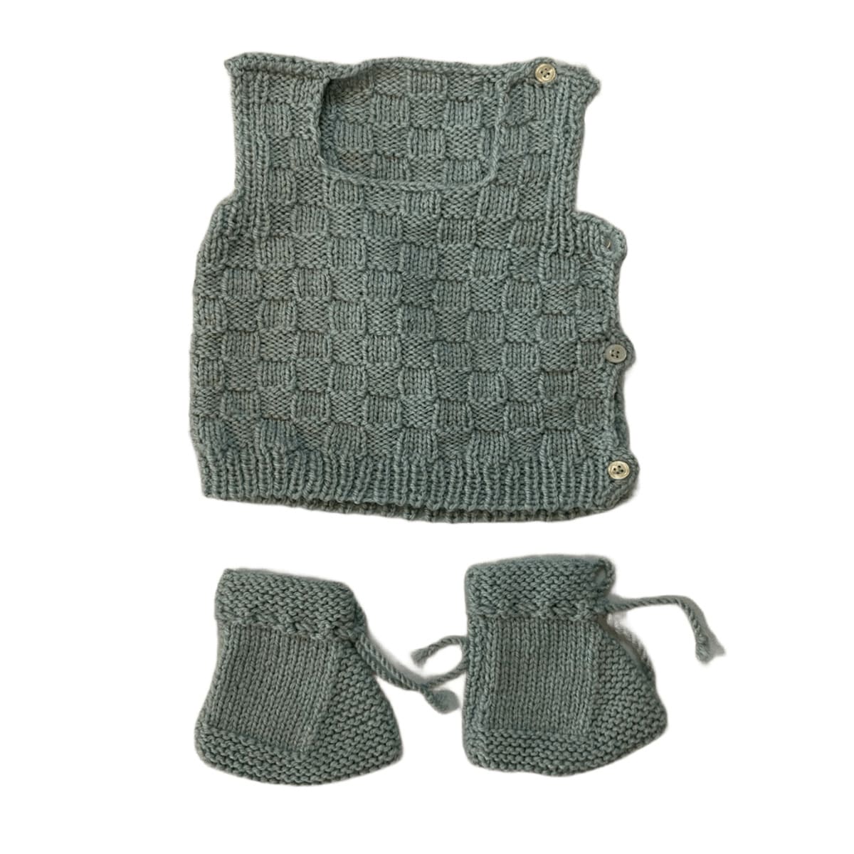 Ensemble: Sac de couchage, Gilet et ses chaussons en laine douce tricotés à la main avec beaucoup de minutie.