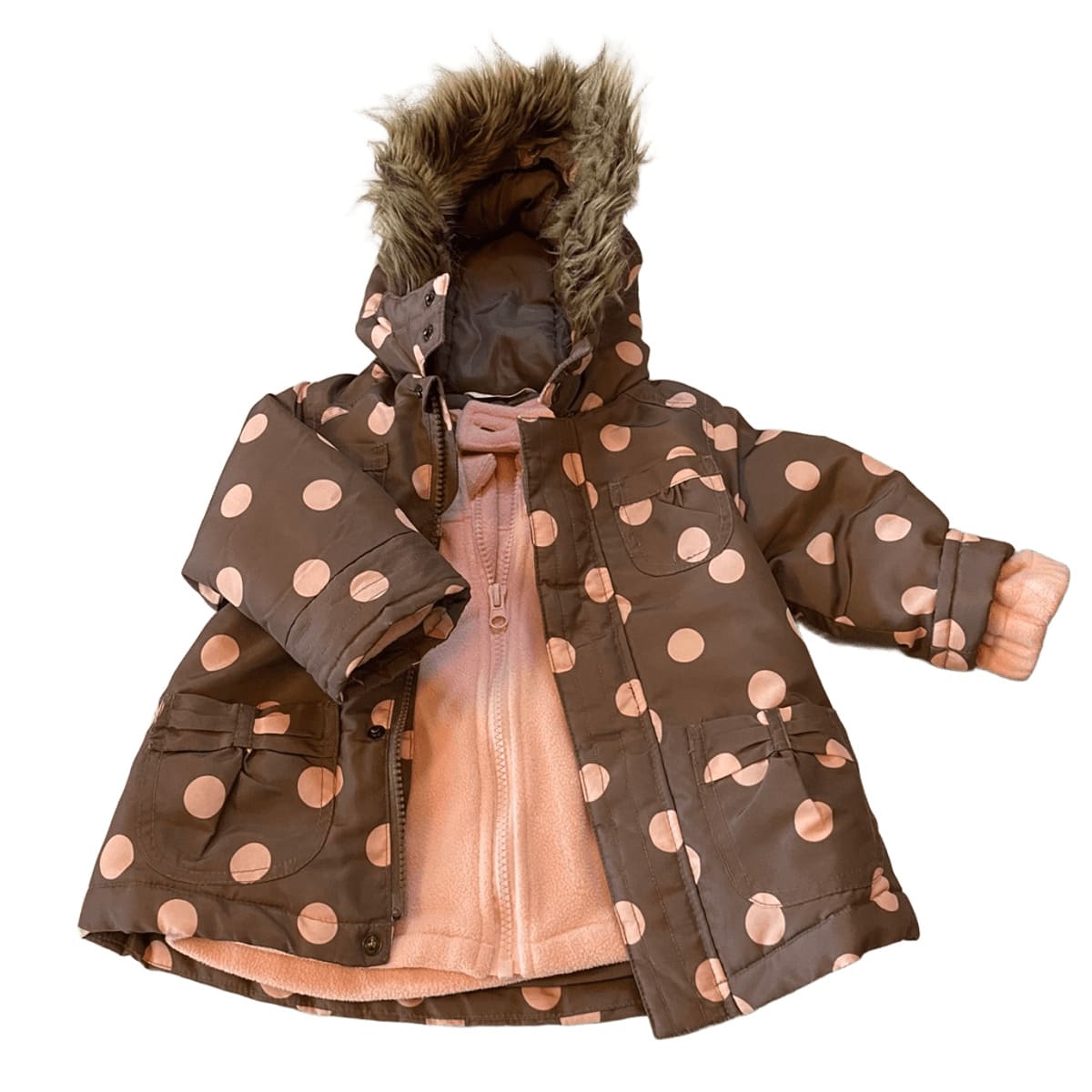 Cette très jolie veste est chaude avec une jaquette en polaire rose en plus à l'intérieur qui peut s'enlever selon le temps.